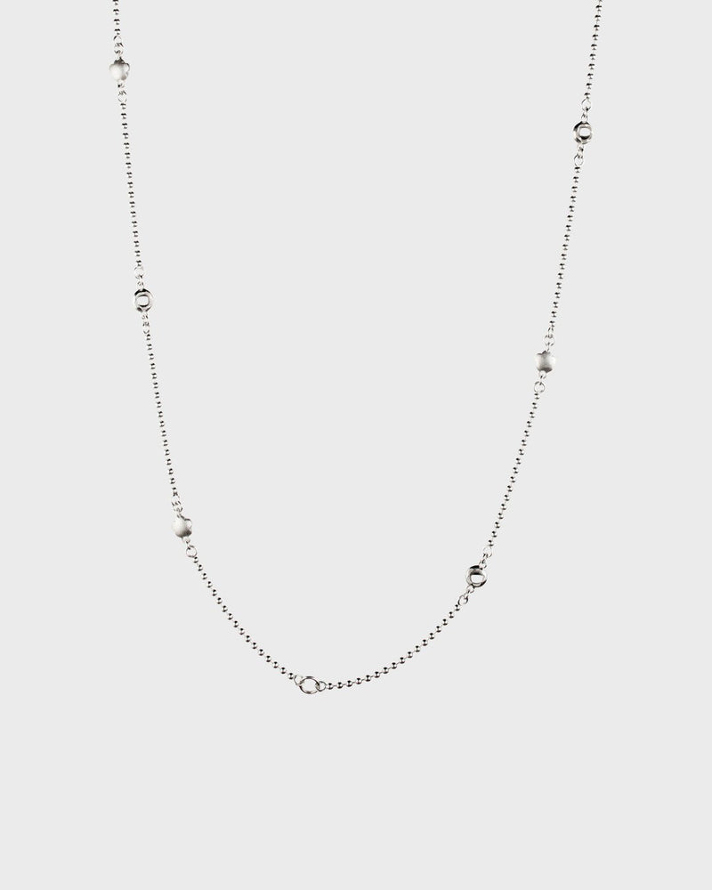 Herkässä Ainoa-kaulakorussa vuorottelevat pehmeän mattahohtoiset pilven muotoiset hopeaelementit ja samaa muotoa toistaviin hopeakehyksiin istutetut kirkkaat vuorikiteet. Käytä kaulakorua joko pitkänä tai kiepauta se kaksinkerroin kaulallesi. Korun lukkona toimivaan kookkaaseen sisäänpäin avautuvalla läppämekanismilla varustettuun renkaaseen voit halutessasi ripustaa lisäkoristeeksi oman suosikkiriipuksesi.