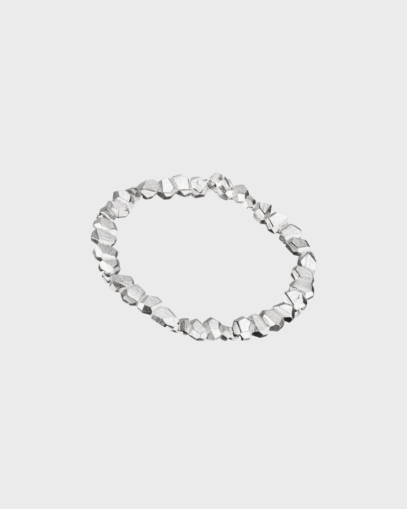 Viileänä hohtava mattapinta korostaa siron rannekorun osien veistoksellisia muotoja. Rannekorun lukitusmekanismi sulautuu taidokkaasti osaksi kokonaisuutta.