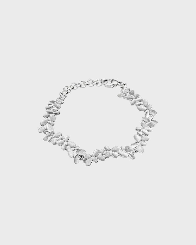 Haave-rannekoru koostuu toisiinsa liitetyistä seppelemäisistä hopeaelementeistä, joiden pienistä mattapintaisista silmuista muodostuu herkkä pitsimäinen kudelma. Papuketju rannekorun päässä mahdollistaa korun pituuden säätämisen juuri sopivaksi (17,5 – 19,5 cm). Papukaijalukko.