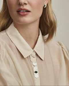 Kirkkaasta hopeasta tehdyissä hienostuneissa korvakoruissa loistavat rombin muotoiset emaloidut hopealevyt. Emaliosat on valmistanut Pauliina Rundgren studiollaan Mikkelissä. Korvakorujen hienostunut pintarakenne tuo mieleen kaarnan ja kävyt, ja vaikutelmaa korostaa emalin syvä metsänvihreä hehku. Tappikiinnitys. Saatavissa myös pronssisina. Emalin vihreä sävy on hieman erilainen kuin vastaavissa pronssikoruissa.