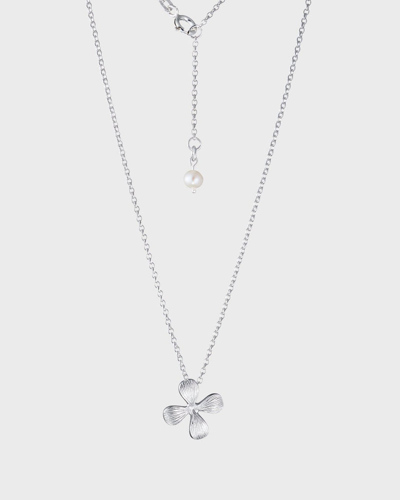 Kevään ensimmäisten kukkien vieno kauneus hopeaan ikuistettuna. Ketjun päätä koristaa pieni valkoinen makeanveden helmi. Säädettävä pituus 45/42 cm.