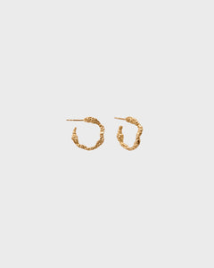 Itu-korvarenkaissa toistuu sarjan koruille tunnusomainen rosoinen, orgaaninen pintastruktuuri. Tappikiinnitys, kullatut taustanastat. Korvarenkaita voi käyttää sellaisinaan, tai niihin voi pujottaa heloja. Korvakorutovatkullattuahopeaa.