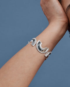 Kirkkaasta hopeasta tehty näyttävä mutta kevyt rannekoru. Käytä Kaaria-rannekorua niin arjen piristyksenä kuin juhlapuvun katseenvangitsijana. Papukaijalukko. Säädettävä pituus 17,5–19,5 cm. Kaaria-rannekoru saatavissa myös pronssisena.