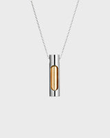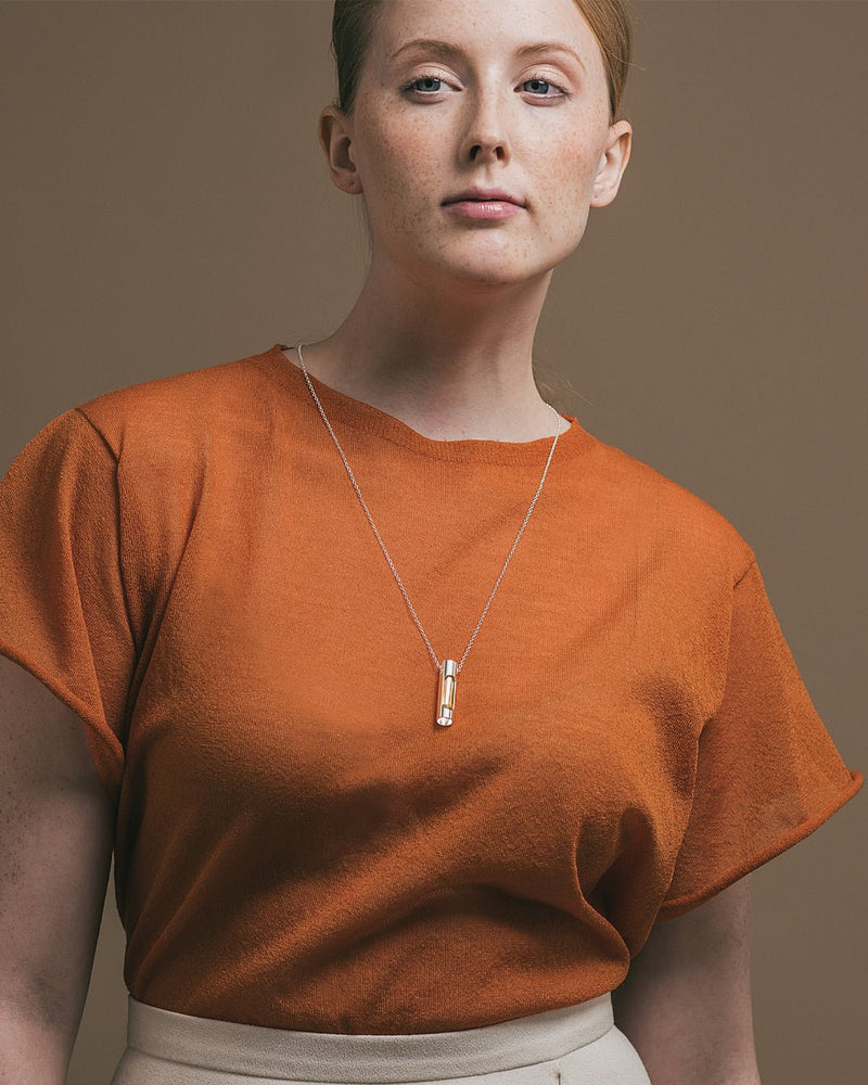 Pelkistetyn hopeaputken suojassa heiluu ja helähtelee kullanhohtoisesta pronssista valettu riipus, kuin viileän ulkokuoren sisällä sykkivä lämmin sydän. Kalevalanmaa-riipus oli osa Suomi 100 -juhlavuoden 2017 mallistoa. Ovaalipapuketju, jousirengaslukko.