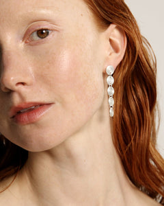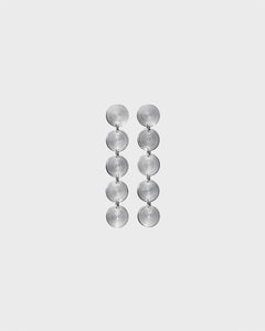 Viisiosaiset Kosmos-korvakorut on valmistettu viileästi välkehtivästä hopeasta. Pienillä lenkeillä toisiinsa yhdistetyt pyöreät pronssilevyt on kuvioitu molemmin puolin. Yksinkertaisuudessaan vaikuttavat pitkät Kosmos-korvakorut ovat asukokonaisuutesi säkenöivät katseenvangitsijat. Tappikiinnitys ylimmässä kiekossa.