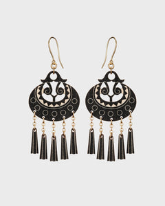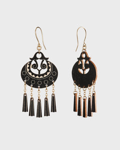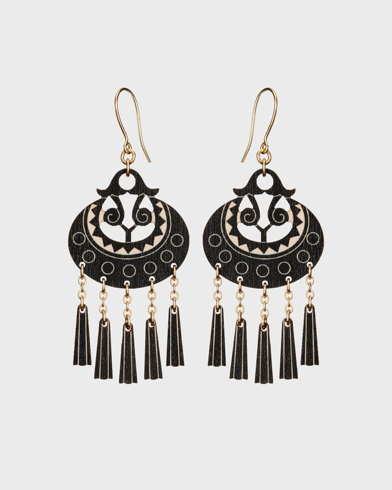 Mustat Kuutar-korvakorut on tehty suomalaisesta vanerista ja värjätty molemmilta puolilta. Korvakorut ovat näyttävät, mutta ilahduttavan kevyet käyttää – ne eivät paina juuri mitään. Tänä vuonna vaneriset Kuutar-korvakorut ovat samankokoiset kuin pronssiset ja hopeiset sisarensa. Koukut kullattua hopeaa, osia yhdistävät lenkit ja ketjut pronssia. Korvakoruja on valmistettu rajoitettu 600 parin erä, ja ne ovat saatavissa ainoastaan Kalevala-verkkokaupasta ja omista Kalevala-myymälöistämme. Huomioithan, että värjätyistä pinnoista ja tummista reunoista saattaa irrota väriä. Vanerikorut pakataan näyttävään Eepos-rasiaan.