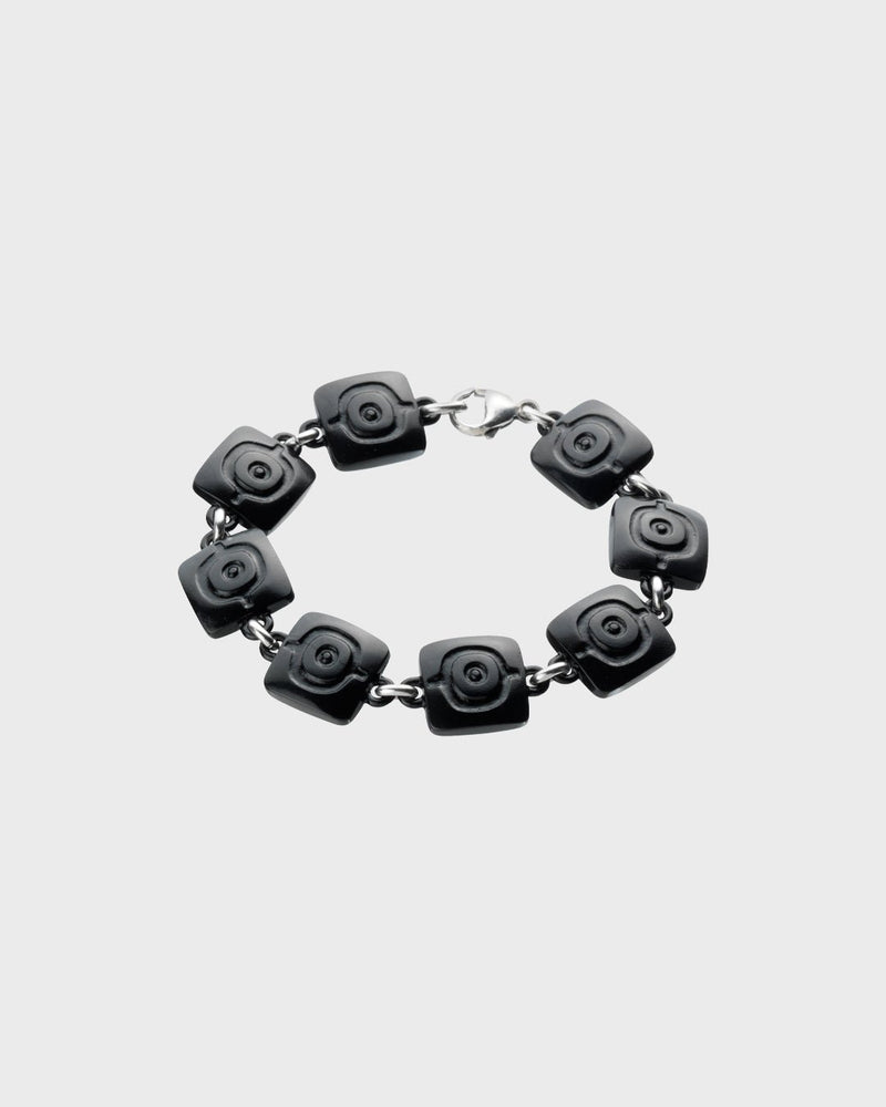Mustasta pronssista valmistettu rannekoru, joka on saanut vaikutteita Australian alkuperäiskansojen taiteesta.