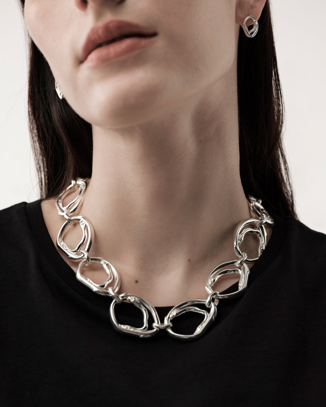 Kullanhohtoisesta pronssista valettu Männyt-rengaskorvakoru on erittäin veistoksellinen ja näyttävä, mutta onton rakenteensa ansiosta miellyttävän kevyt käyttää. Sileään, pehmeästi aaltoilevaan pintaan luo jyrkän kontrastin rosoinen struktuuri korvakorun toisella syrjällä. Rosoinen struktuuri tulee joko näkyville tai jää piiloon riippuen siitä, kumpaan korvaan puet korvakorun. Korvakorut ovat toistensa peilikuvat. Korvakorut on saranoitu, ja niiden hopeinen kiinnitystappi lukittuu korvakorun sisään piilotettuun silikonitulppaan. Suosittelemme säilyttämään korua saranamekanismi auki.