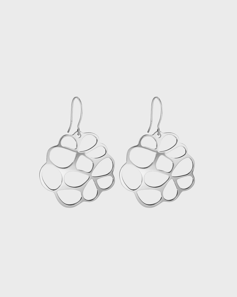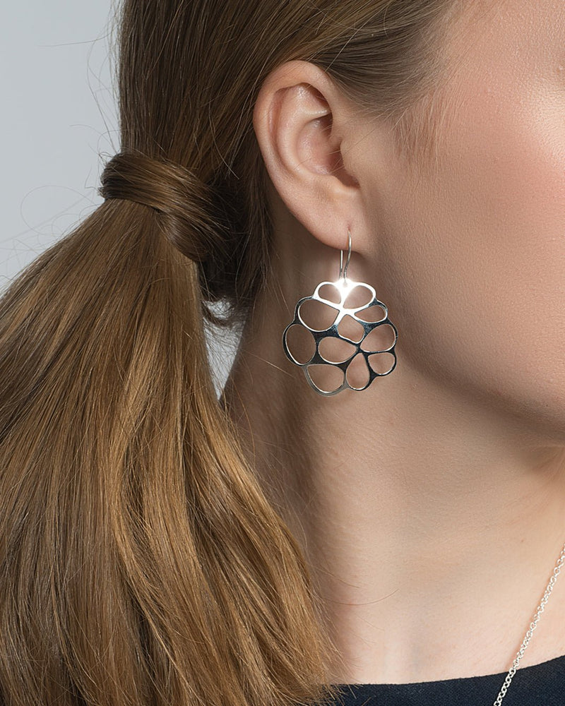Hopeiset näyttävät Mimosan hetki -korvakorut. Mimosa-koruissa eletyt hetket punoutuvat yhteen tarinoiden verkoksi, joka on epäsymmetrinen ja yllätyksellinen, yhtä aikaa vahva ja herkkä, kuin elämä itse.