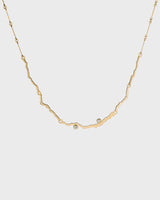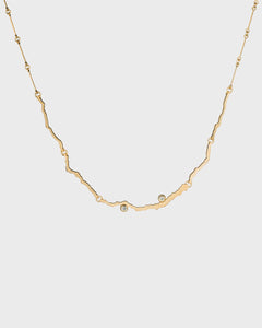 Pimenevien syysiltojen hiljaisuus ja kuun välkehtivä heijastus veden pinnalla ovat innoittaneet Taru Harmaala Chaloffia Kuutamoinen-kokoelman suunnittelussa. 14 karaatin kullasta tehtyyn kaulakoruun on istutettu kaksi taidokkaasti hiottua välkehtivää timanttia. Timanttien yhteispaino 0,12 ct. Ketjussa säädettävä pituus 44/47 cm. Papukaijalukko.