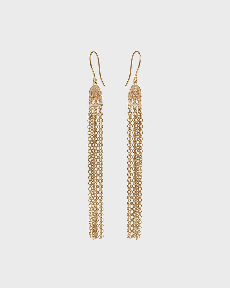 Vanhan klassikon uusi tulkinta. Korvakorun holvikaaren muotoisesta kauniisti kuvioidusta riipusosasta riippuu kuusi pitkää rinnakkaista ankkuriketjua. Riipusosan nurja puoli on sileä. Korvakorut ovat kirkasta pronssia.
