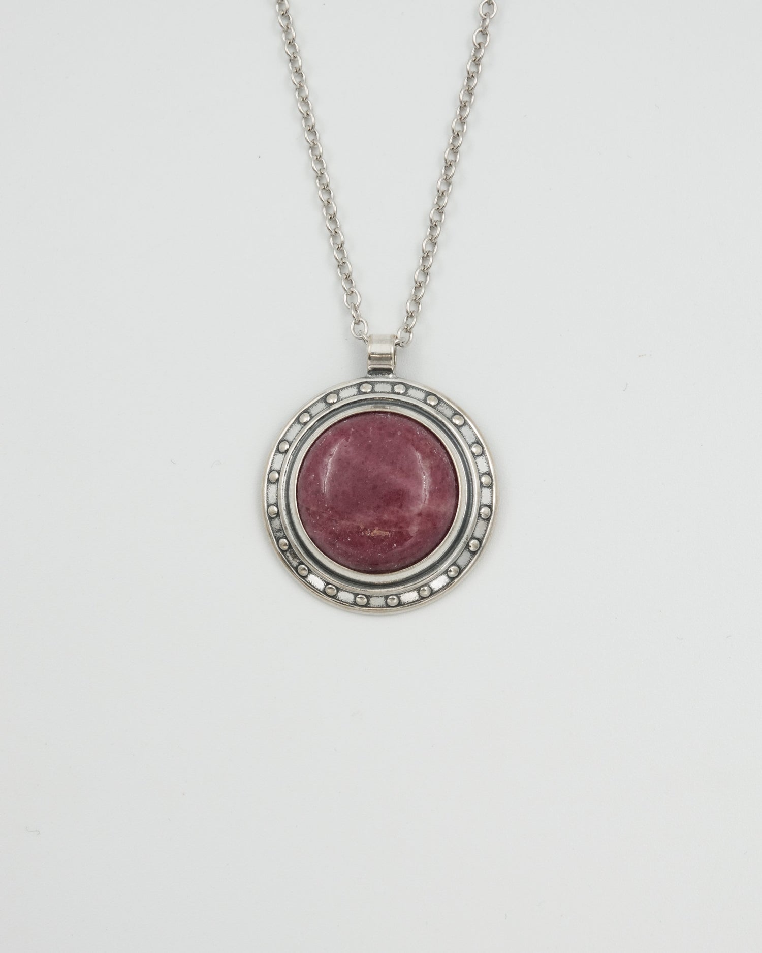 Pyöreän hopeariipuksen kehyksen koristeaihe on saatu Räisälän Hovinsaaresta löydetystä rannekorusta. Vaaleanpunainen kivi on suomalaista rodoniittia. Ankkuriketju 60 cm, jousirengaslukko. Riipuksen leveys 26 mm.