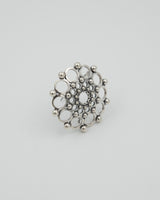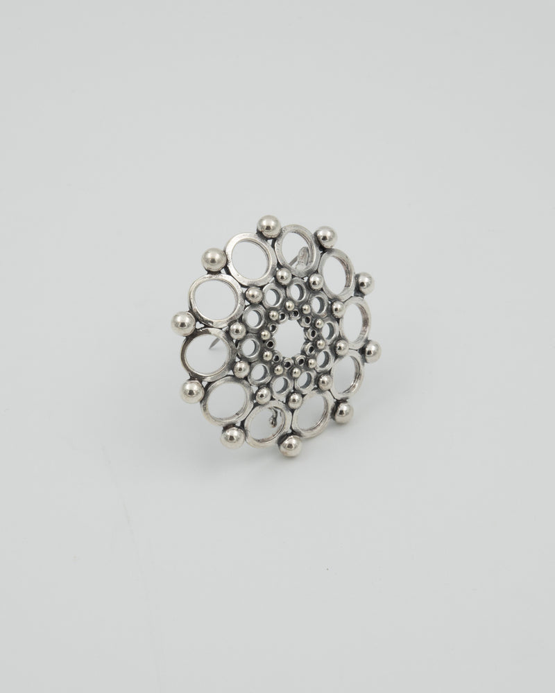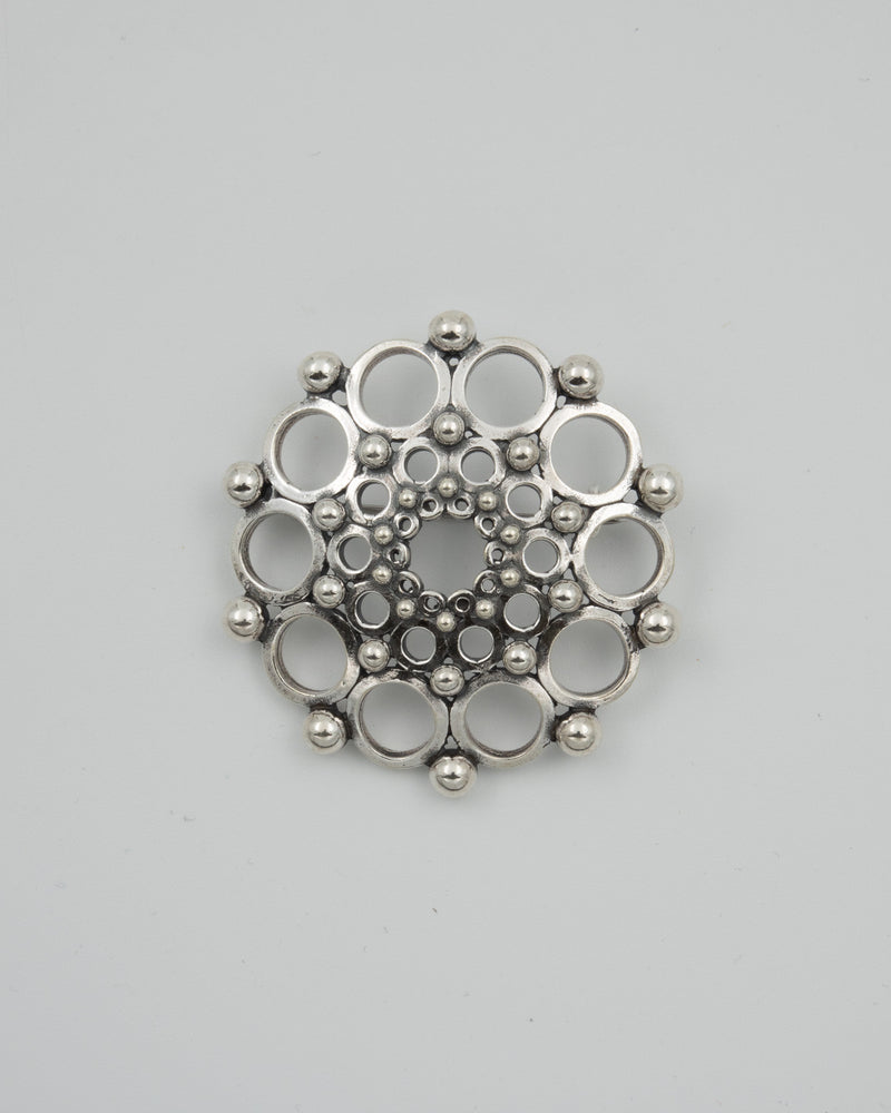 Näyttävän, mutta ilmeeltään pitsimäisen keveän rintakorun on suunnitellut kultaseppä Kai Lindström 1960-luvulla.