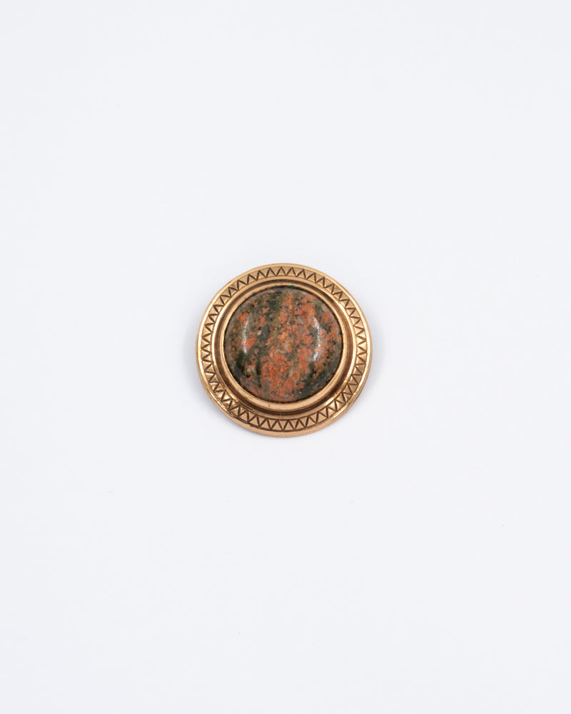 Rintakorun pyöreää kehystä koristaa sahalaitakuvio. Kirjava kivi unakiittia. Rintakorun leveys 26 mm.