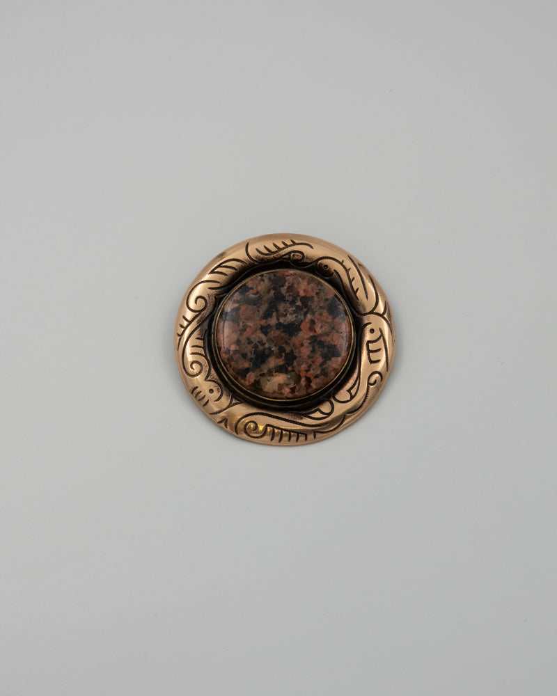 Punaruskeaa graniittia ympäröi pronssikehys, jonka mallina on ollut rautakaudella valmistettu kehäsolki. Rintakorun leveys 48 mm.