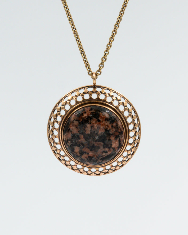 Näyttävän pronssiriipuksen kehyksen pitsimäinen koristekuvio on kopioitu hopeisesta rengassoljesta, joka on peräisin Inarista. Koru suunniteltiin 1970-luvulla Rovaniemellä järjestettyjen Kalevalaisten Naisten Liiton Suvijuhlien koruksi. Korun punaruskea kivi on suomalaista graniittia. Riipuksen leveys 45 mm.
