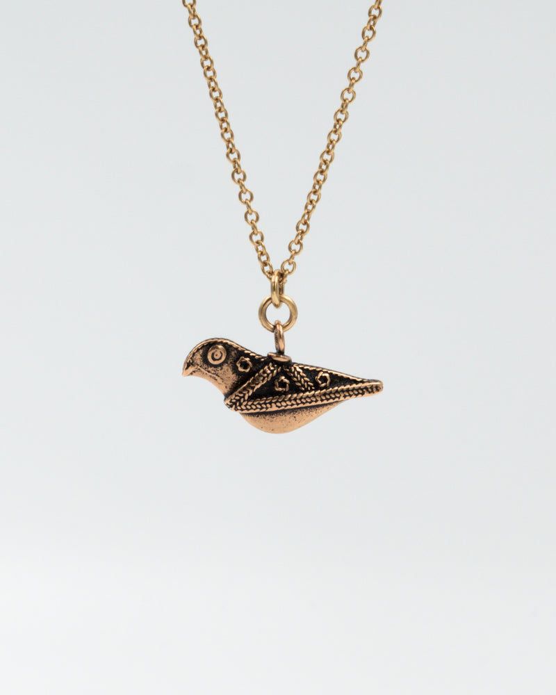 Hattulan linnun esikuvana on ollut filigraanikoristeinen hopealintu, joka on löydetty Hattulan Luurilasta. Korusta on ollut Kalevala Korun mallistossa vuosikymmenien saatossa erilaisia ja -kokoisia versioita, jalallisia ja jalattomia. Tämä pieni jalaton versio, joka tuli mallistoon 1960-luvulla, on esikuvalleen uskollisin. Pullea valettu lintu on kuvioitu molemmin puolin. Ankkuriketju 60 cm, jousirengaslukko. Leveys 32 mm.