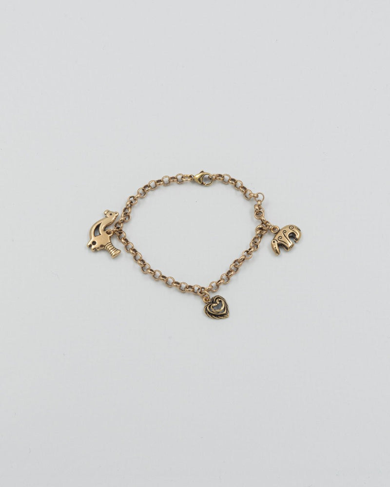 Pronssiseen papuranneketjuun (leveys 4 mm) on kiinnitetty kolme pientä helaa: Kalevankarhu, Lintunen ja Talon sydän.