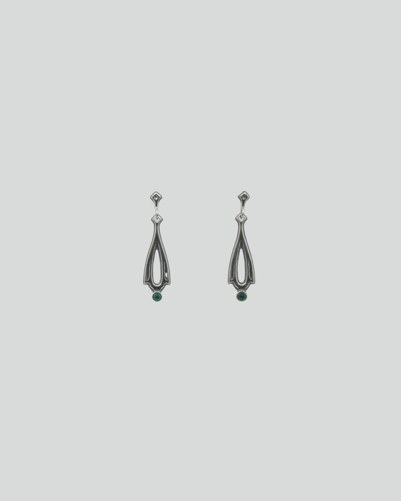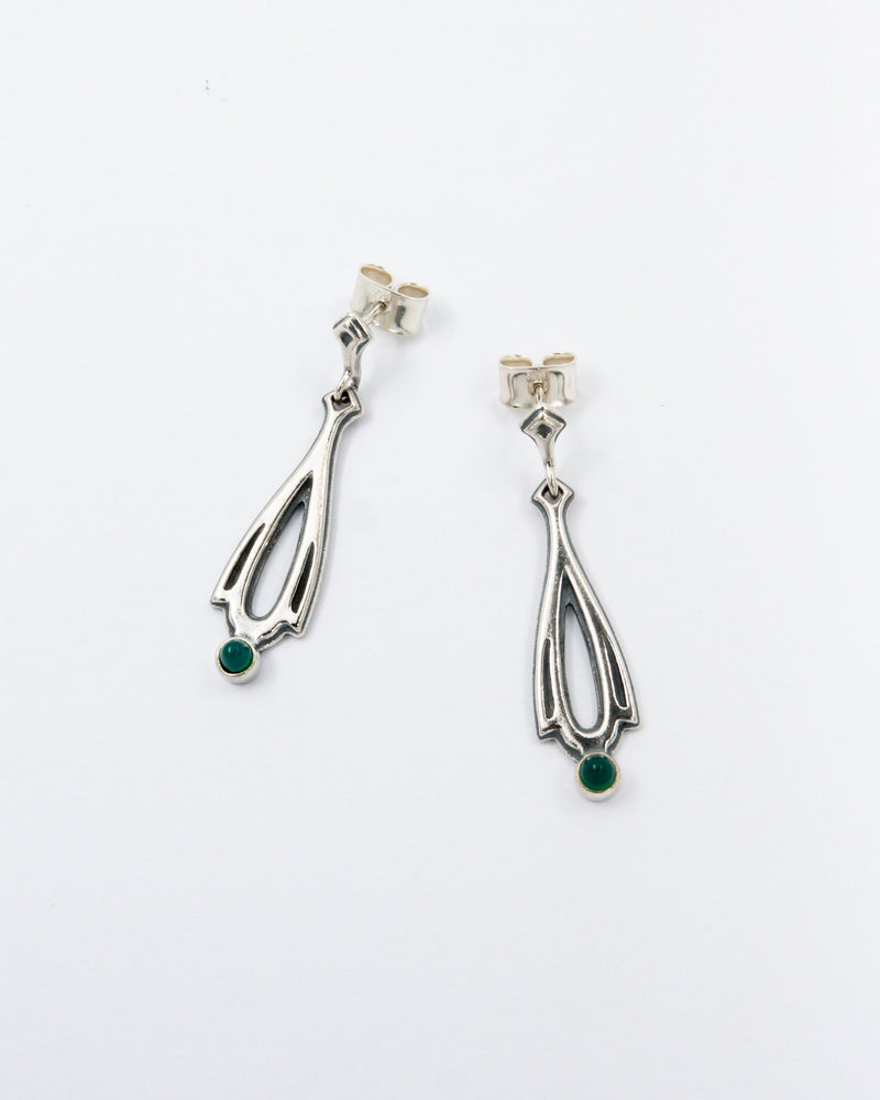 Jugend-henkisen Illusioni-sarjan suunnitteli vuosituhannen vaihteessa kultaseppä Tony Granholm. Korusarjan hopeaversioissa loistaa vihreä akaatti. Tappikiinnitys. Korkeus 43 mm, leveys 11 mm.