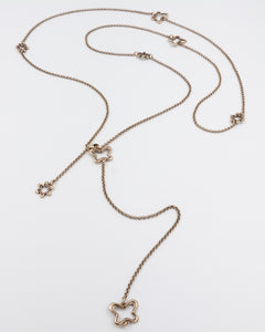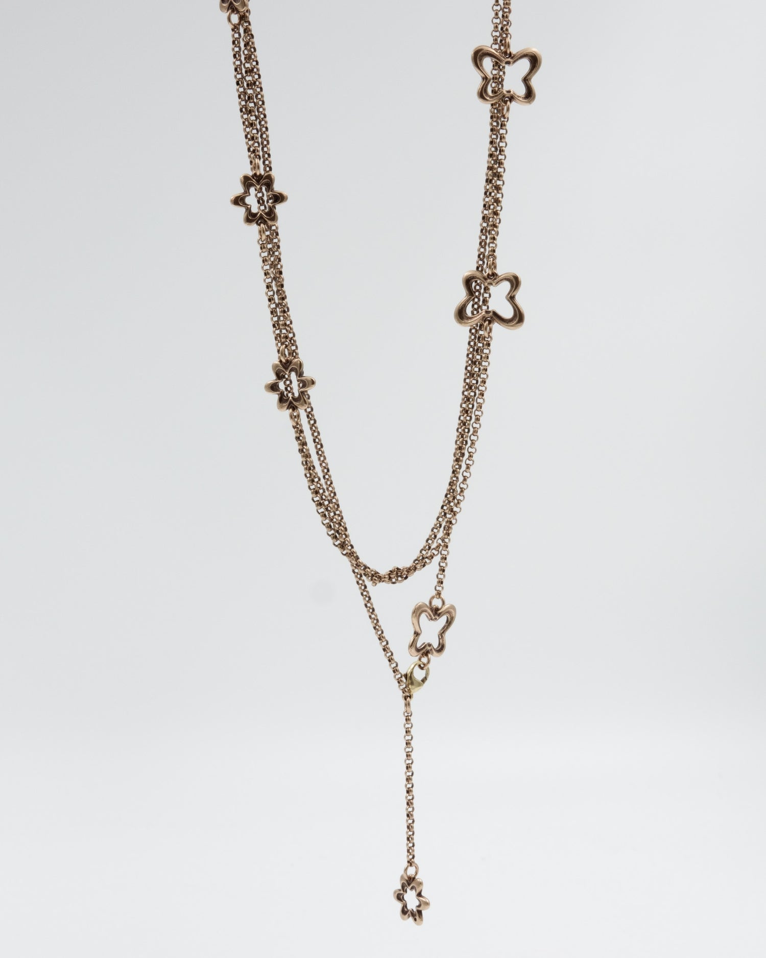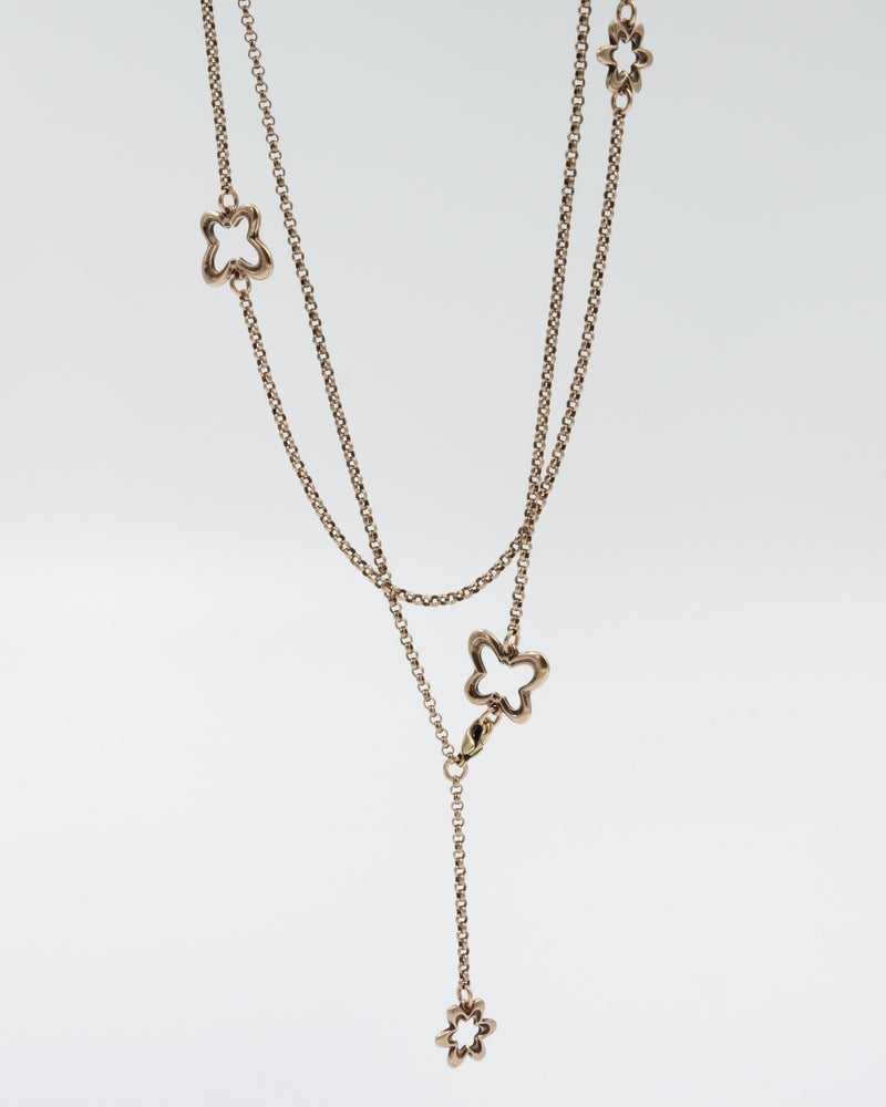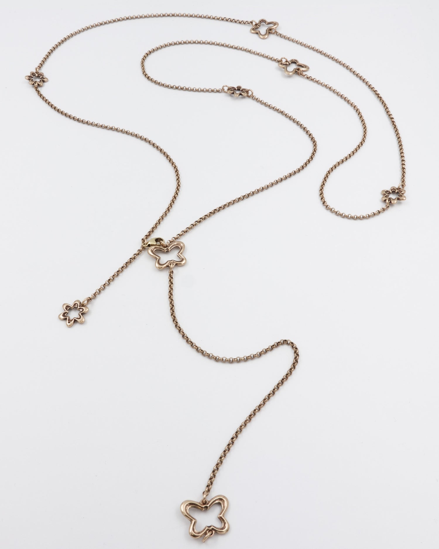 Ilona-korun on suunnitellut kultaseppä Tony Granholm. Korua voit käyttää pitkänä kaulakoruna tai lyhyempänä kaksin- tai kolminkerroin kaulalle kieputettuna. Korun perhoset ja kukat on kuvioitu molemmin puolin. Papukaijalukko. Pituus 138 cm.