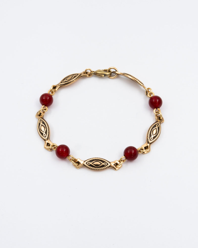 Karelia-korusarjan suunnitteli 2000-luvun alussa kultaseppä Tony Granholm. Karelia-rannekorussa vuorottelevat kauniisti kuvioidut pronssilaatat ja punaiset karneolihelmet (halkaisija 7 mm). Papukaijalukko. Pituus ei ole säädettävä.
