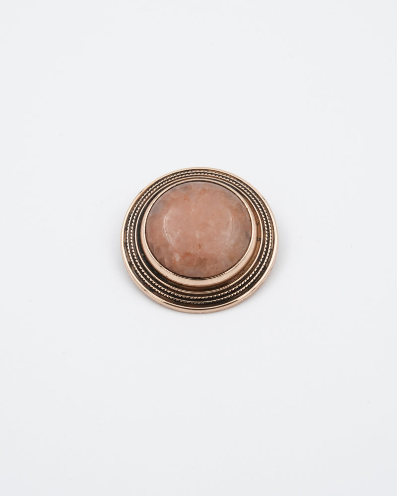 Pyöreän rintakorun kehyksen koristeaihe on 1800-luvulla valmistetusta kultaisesta soljesta, jonka Aurora Karamzin lahjoitti Träskändan kartanon opettajattarelle. Pronssia, kellertävä kivi aurinkokvartsi. Rintakorun leveys 32 mm, teräsneula.