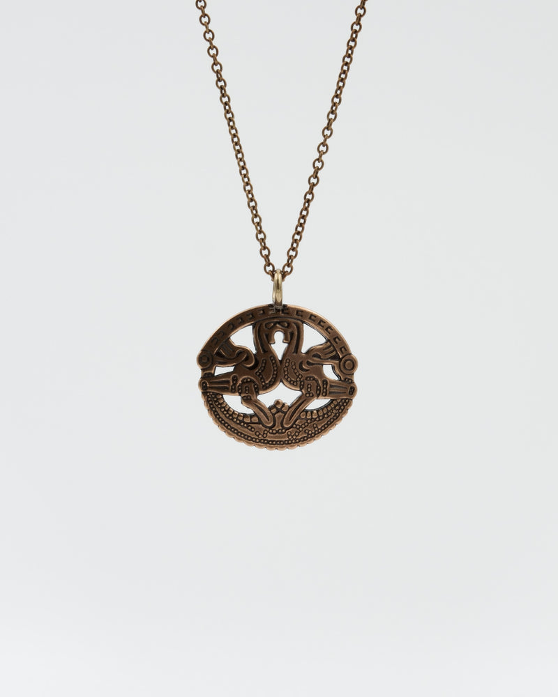 Kuhmoisten kukot -riipukseen on kuvattu kaksi lintua nokikkain. Korun viikinkiaikainen esikuva on löydetty Kuhmoisten Papinsaaresta. Ankkuriketju 60 cm, jousirengaslukko. Aavistuksen kupera riipus on nurjalta puolelta sileä. Riipuksen leveys 30 mm.