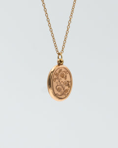 Pronssista medaljonkia koristaa herkkä kukkakuvio. Medaljongin esikuva on Tornionjokilaaksosta 1800-luvulta. Leveys 19 mm, korkeus riipuslenkkeineen 35 mm. Kuvioitu molemmin puolin. Ankkuriketju 60 cm, jousirengaslukko.