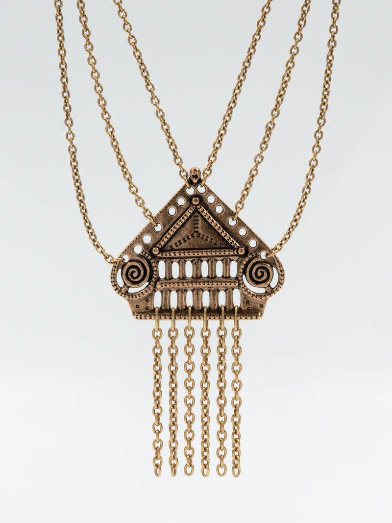 Massiivinen pronssikaulakoru on ollut Kalevala Korun tuotevalikoimassa1970-luvulla. Koru on sommiteltu Lopelta Salon kartanon mailta löydetyn pronssiriipuksen katkelman pohjalta. Riipusosan leveys 70 mm, korkeus ketjuhapsuineen 125 mm. Nurja puoli kuvioimaton. Kaulakorun pituus n. 70 cm. Koukkulukko.
