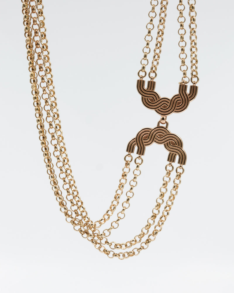 Lämpimästi hohtavasta pronssista tehdyn Louhetar-kaulakorun nauhapunoskoristeita yhdistää neljä papuketjua. Nauhapunoskoristeet (leveys 34 mm) toimivat kaulakorun lukitusmekanismina, ja voit muunnella korun ilmettä lukitsemalla koristeet niskan taakse, eteen kaulalle tai sivulle. Louhetar oli syksyn 2020 koru-uutuus.