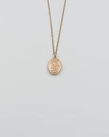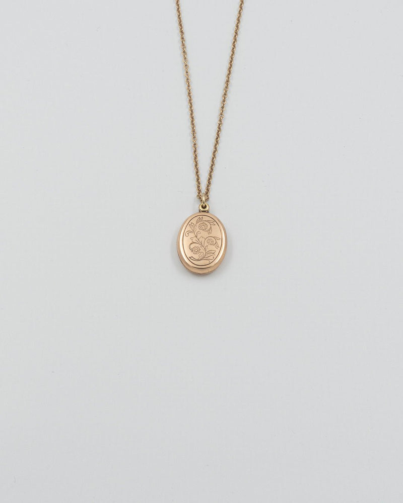 Pronssista medaljonkia koristaa herkkä kukkakuvio. Medaljongin esikuva on Tornionjokilaaksosta 1800-luvulta. Leveys 19 mm, korkeus riipuslenkkeineen 35 mm. Kuvioitu molemmin puolin. Ankkuriketju 60 cm, jousirengaslukko.