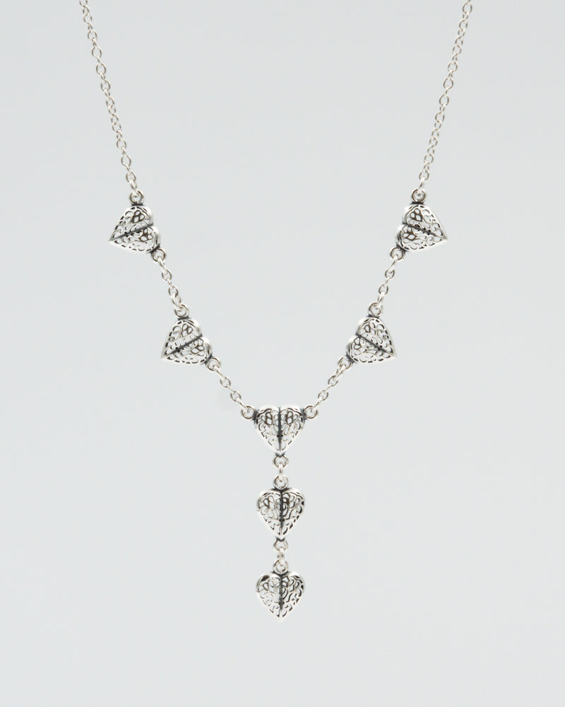 Pitsimäinen Onnensydän-korusarja on Marja Sunan käsialaa 2000-luvulta. Kaulakorussa säädettävä pituus 42/45 cm.