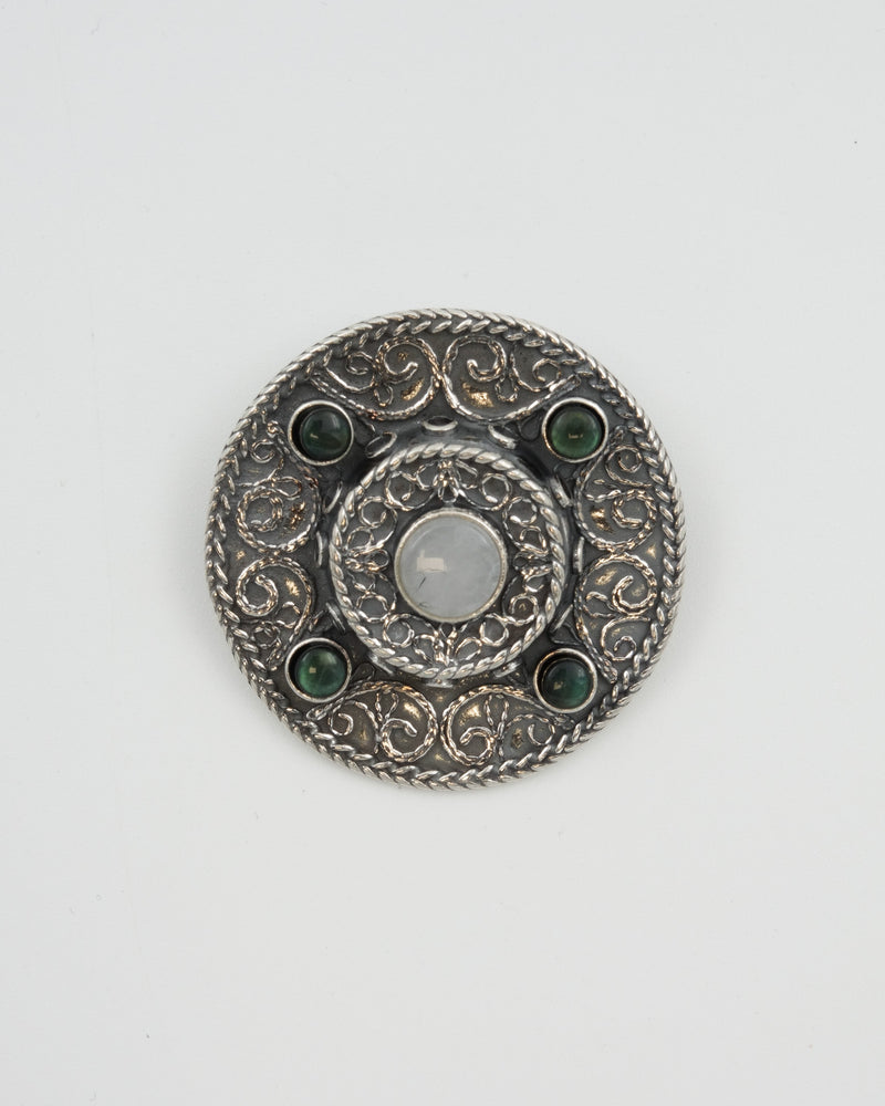 Rintakorun esikuvana on ollut Raision Mahittulan kaivauksilta löydetty filigraanikoristeinen hopeasolki, joka on ajoitettu 1100-luvulle. 1970-luvulla Kalevala Korun mallistoon tulleeseen koruun on istutettu lumikvartsi ja neljä pientä spektroliittia. Leveys 38 mm.