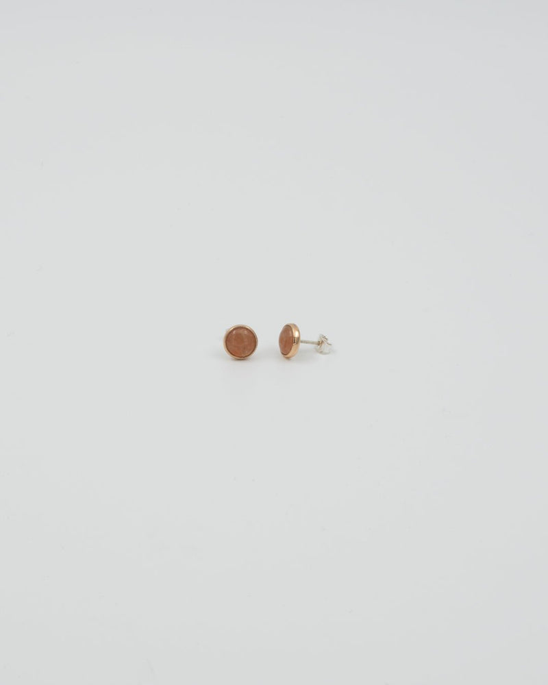 Ruska-korvakorujen eleettömään pyöreään pronssikehykseen on istutettu kauniisti hiottu keltaoranssi aurinkokvartsi. Tappikiinnitys, tappi ja taustanasta hopeaa. Korvakorun halkaisija 10 mm.