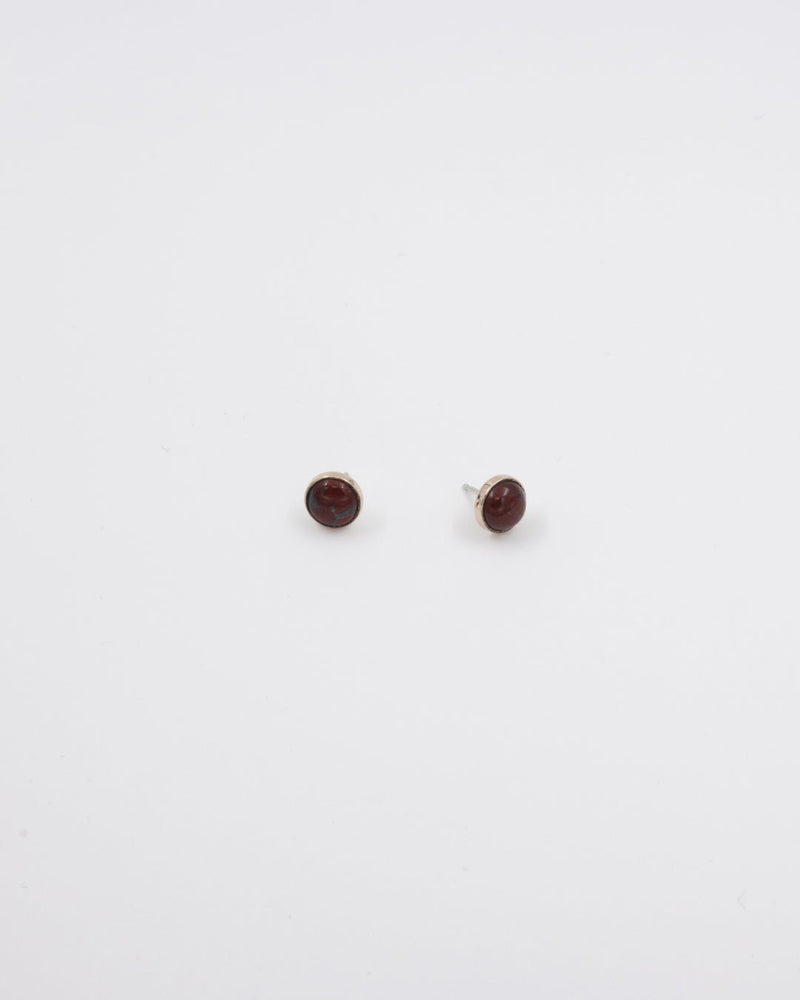 Ruska-korvakorujen eleettömään pyöreään pronssikehykseen on istutettu kauniisti hiottu tiilenpunainen jaspis. Tappikiinnitys, tappi ja taustanasta hopeaa. Korvakorun leveys 10 mm.