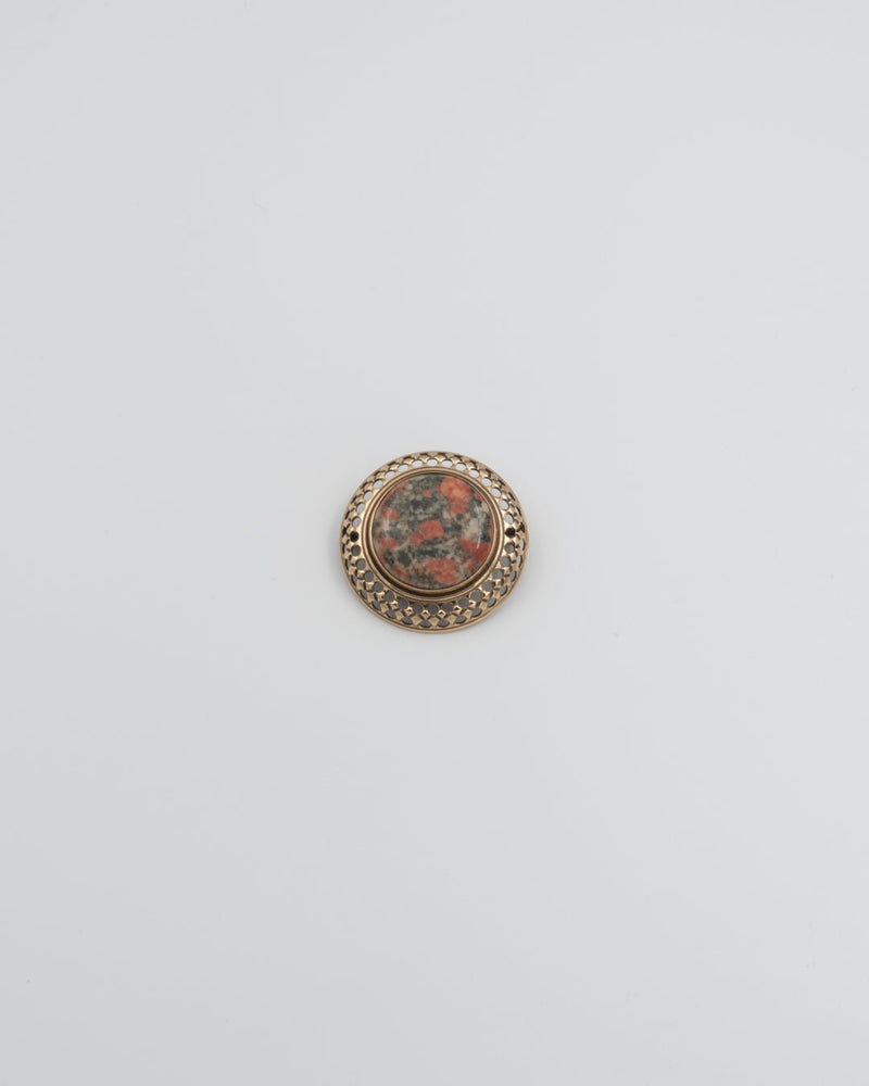 Näyttävän rintakorun kehyksen pitsimäinen koristekuvio on kopioitu hopeisesta rengassoljesta, joka on peräisin Inarista. Koru suunniteltiin 1970-luvulla Rovaniemellä järjestettyjen Kalevalaisten Naisten Liiton Suvijuhlien koruksi. Kirjava kivi on unakiittia. Rintakorun leveys 45 mm.