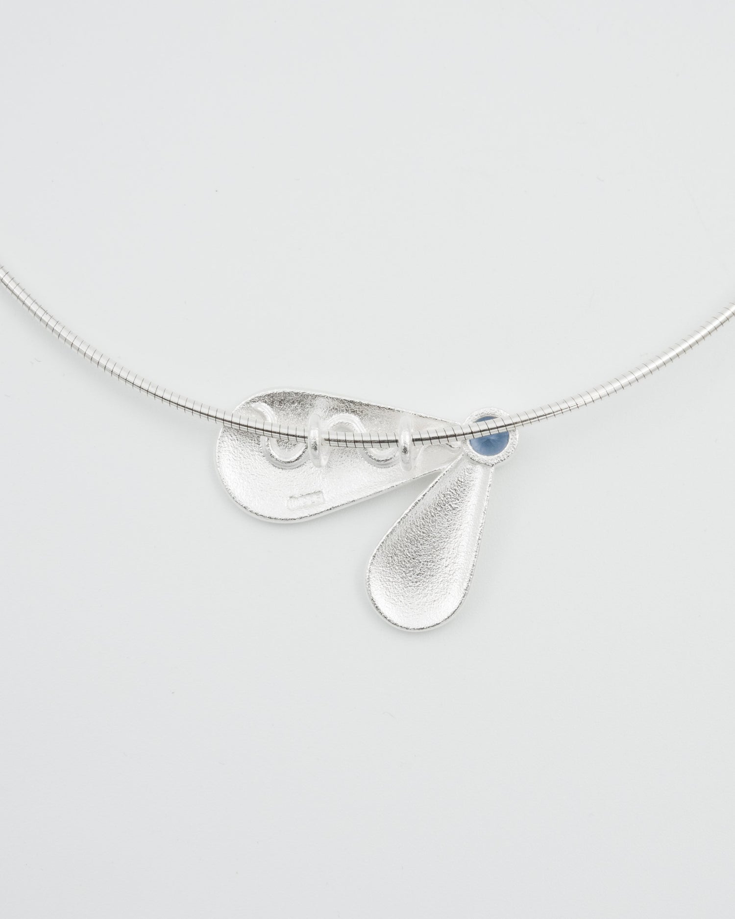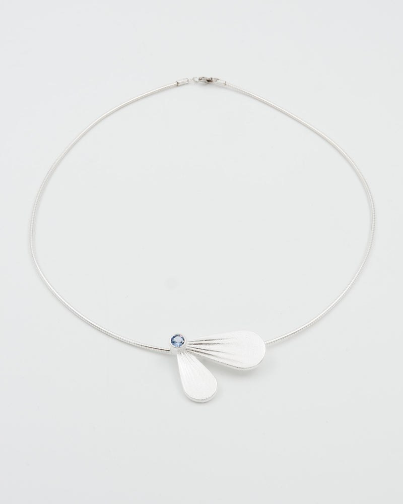 Terälehdet-korun on suunnitellut kultaseppä Terhi Koivisto. Hopeavaijeriin pujotetussa riipuksessa on satiinimainen pinta. Korussa loistava syvänsininen kivi on briljanttihiottu synteettinen spinelli. Riipusosan leveys 32 mm. Vaijerin pituus 45 cm, pituus ei ole säädettävä. Papukaijalukko.
