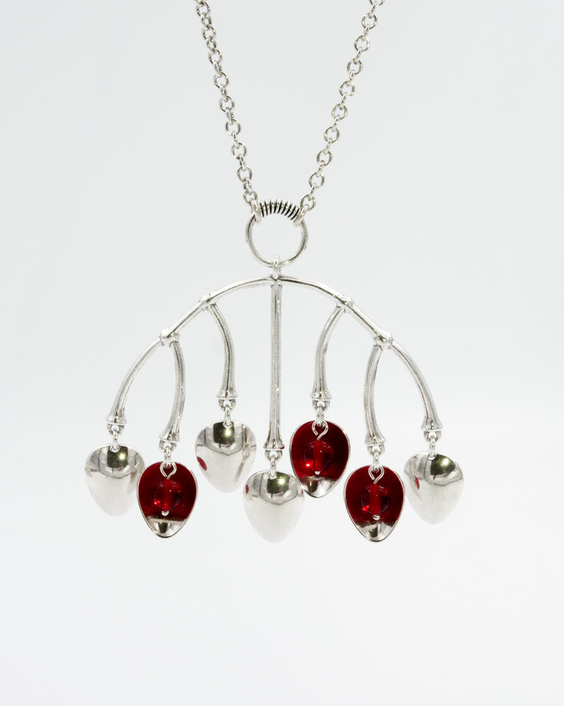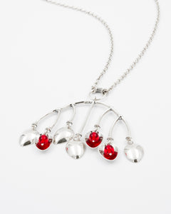 Hopeisen Tunturimarja-korusarjan on suunnitellut Erja Hirvi. Näyttävässä kaulakorussa heilahtelevat pisaranmuotoiset maljamaiset laukkaset ja kolme pientä syvänpunaista lasihelmeä. Ankkuriketjussa säädettävä pituus 70/80 cm, jousirengaslukko. Leveys 71 mm.