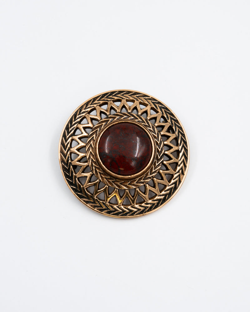 Rintakorun kehyksen esikuvana on ollut kehäsolki, joka on löydetty Uskelan Lukkarinmäestä. Tiilenpunainen kivi suomalaista jaspista. Rintakorun leveys 44 mm.