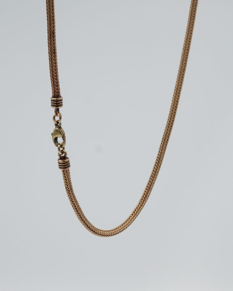 Ohuesta pronssilangasta punotussa verkkoketjussa on pronssista valetut päätydopit ja papukaijalukko. Punoksen paksuus 3 mm.