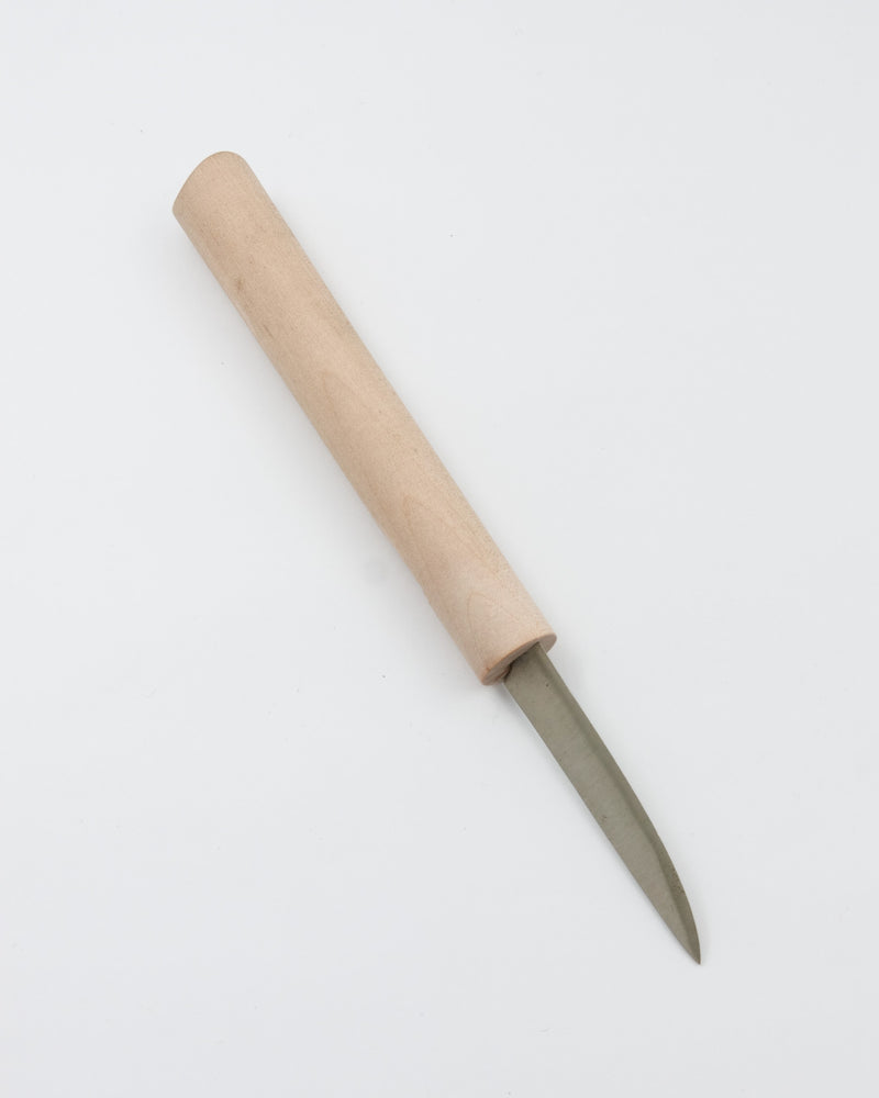 Kaarinan Kirkkomäen muinaispuvun puukossa on pelkistetty vaalea puukahva ja tylppä terä.