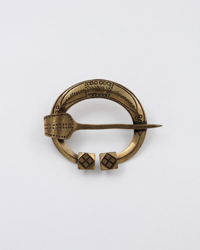 Perniön muinaispuvun korustoon kuuluu kolme erilaista hevosenkenkäsolkea. Pronssia, teräsneula.
