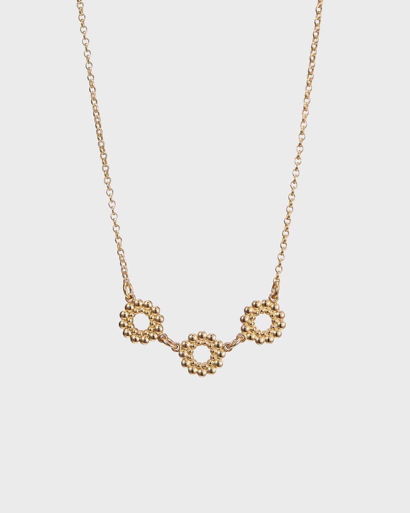 Valoisa-kaulakorussa kolme pyöreää elementtiä yhdistyvät harmoniseksi kokonaisuudeksi. Tiina Arkon suunnittelema koru kuvastaa valoa ja iloa – jokainen 11 mm:n elementti on kuvioitu huolella molemmin puolin.